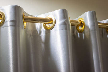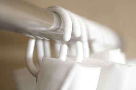 Blurred white plastic hooks curtains for bath. Hooks on an aluminum rod for bathroom curtains. Selective focus