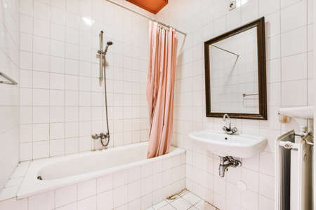 Small bathroom red curtain . View of washbasin cabinet with mirror in my home