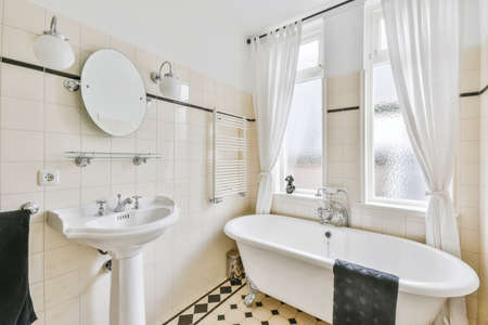 Details of an old bathroom with a large window, decoration in the style of Popart culture.