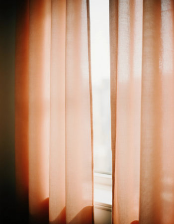 Light streams through soft beige and peach curtains, creating a warm and inviting atmosphere in a serene indoor space with a touch of elegance.