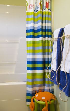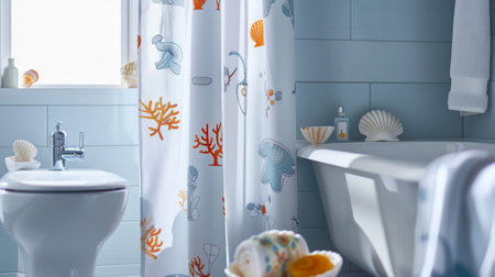 A subtle underwater theme comes to life in this playful bathroom with a shower curtain decorated with e cartoon sea creatures and a set of shellshaped soap dishes