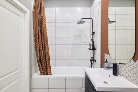Stylish bathroom with a striped shower curtain, sleek fixtures, and elegant tile work, perfect for contemporary home designs.