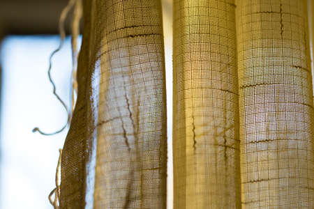 Wonderful vivid dawn from window through patterned curtain. Amazing warm sky behind silhouettes of tulle texture. Orange sunlight. Cosiness textured colorful background with sunrise. Copy space.