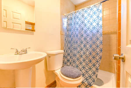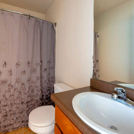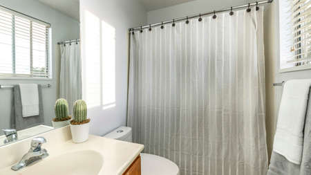 New construction modern home bathroom with curtain and shower. Wonderful California home in San Diego county. Real estate listings with powerful visuals.