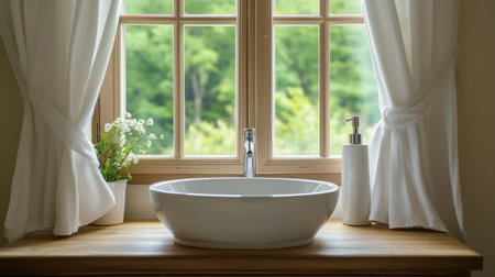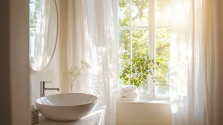 A bright bathroom interior featuring a white sink, soft curtains, and natural light streaming through a window, creating a serene and inviting atmosphere.