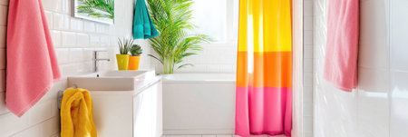 This bright bathroom showcases a shower tub combo with a colorful geometric shower curtain. Lush greenery and vibrant towels enhance the cheerful and practical design creating an inviting atmosphere.