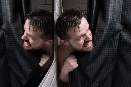 Wet man looks out from behind a shower curtain, looks evilly at someone and bares his teeth.