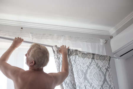 An adult man hangs a curtain with a curtain on the window. Household chores and new renovation.