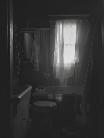 This image captures soft morning light filtering through sheer curtains, creating delicate shadows on a window sill, evoking a serene atmosphere.