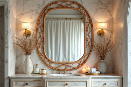 Elegant marble bathroom with wicker mirror and warm lighting decor. That the image is generated using AI.