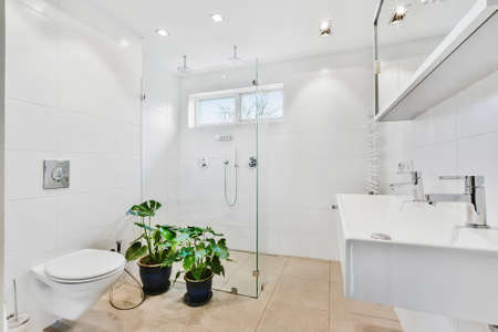 Interior of contemporary bathroom with shower and sink in minimal style in flat