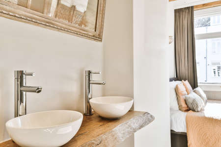 Two small oval sinks with comfortable taps on a wooden table