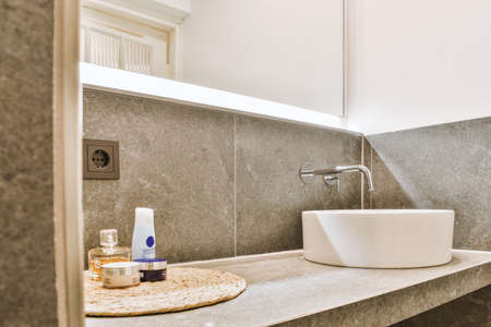 Stylish bathroom sink with many accessories in here