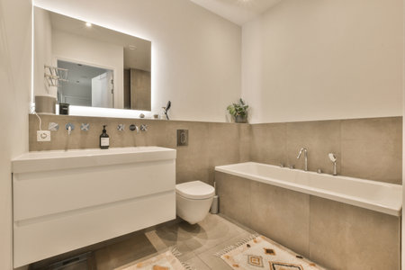 Superb bathroom in beige tones with large cozy bathtub