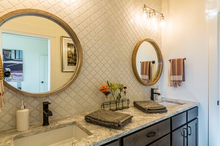 Elegant warm color bathroom design in a freshly remodeled house.
