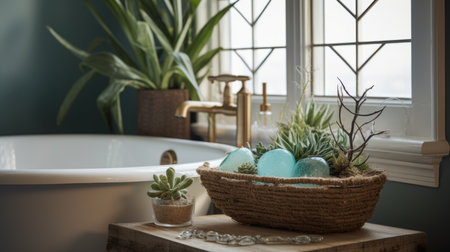 Interior design of Bathroom in Coastal style with Bathtub decorated with Woven, Stone, Glass, Wood material. Coastal architecture. Generative AI AIG24.