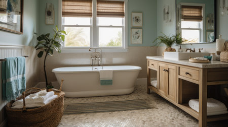 Interior design of Bathroom in Coastal style with Clawfoot tub decorated with Subway tile, Wicker material. Traditional architecture. Generative AI AIG24.