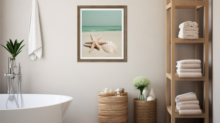 framed print of a sandy seashell beach, featuring a meticulously detailed and realistic scenery. the light emerald and light brown color palette creates a soft shading effect, enhancing the elegant and simple composition. this staged photography captures the beauty of the seashell beach, making it a perfect choice for wallpaper or decor. ai generated