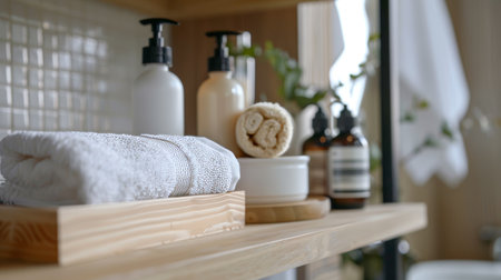 Cozy Bathroom Essentials. Towels, Skincare Bottles, and Bathroom Decor on Wooden Shelves