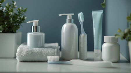 A minimalist bathroom countertop display featuring grooming essentials arranged neatly during the morning hours