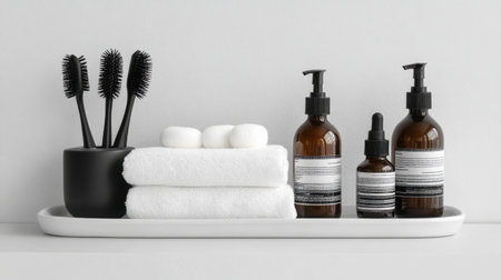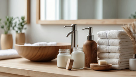 A serene bathroom countertop featuring soft towels, elegant skincare products, and a minimalist design that promotes relaxation and cleanliness.