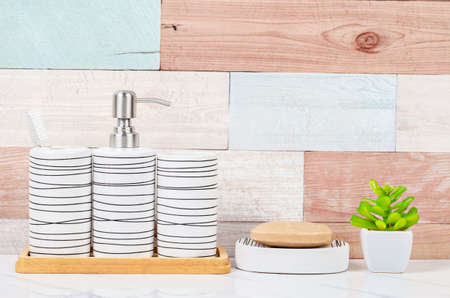 Set of eramic pump bottle for liquid soap or shampoo with herbal soap on marble background.