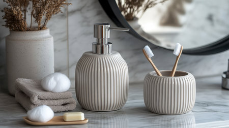 A chic bathroom setup with a soap dispenser, toothbrush holder, and cotton jar all in matching ceramic designs on a marble countertop.
