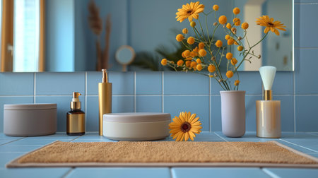 A serene bathroom counter showcasing skincare products, natural decor, and fresh flowers. Ideal for self-care and wellness themes in modern interiors.