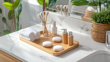 A chic bathroom scene featuring a bamboo tray with cotton pads, skincare bottles, and towels, enhanced by natural light and greenery, offering a serene and organized atmosphere.