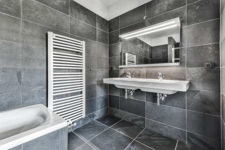 Modern home interior design of light bathroom with white ceramic tiles and bathtub with shower