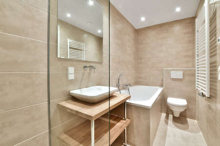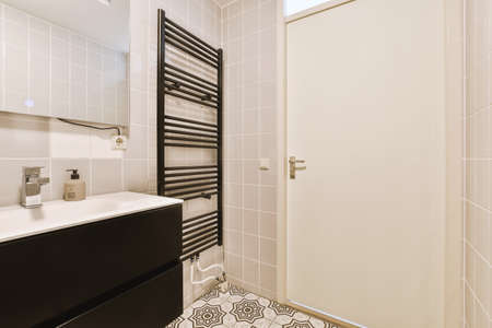 Interior of contemporary bathroom with shower and sink in minimal style in flat