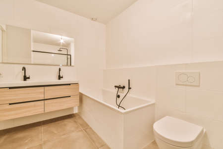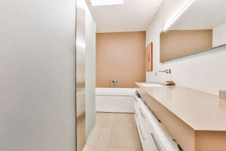 Interior of light restroom with clean bathtub and colorful cupboards with sinks in modern apartment
