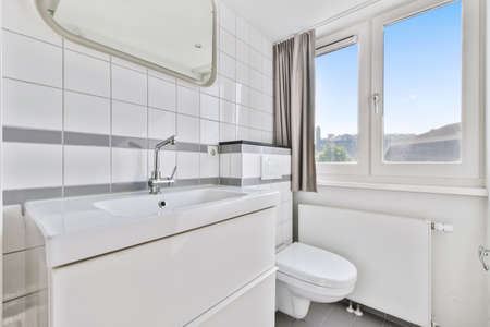Interior of modern restroom with ceramic sink and white toilet in new flat