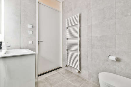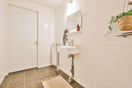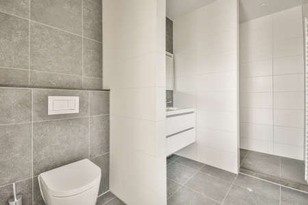 Interior of contemporary bathroom with shower and sink in minimal style in flat