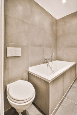 White bathtub with metal faucet in modern bathroom in minimal style in apartment