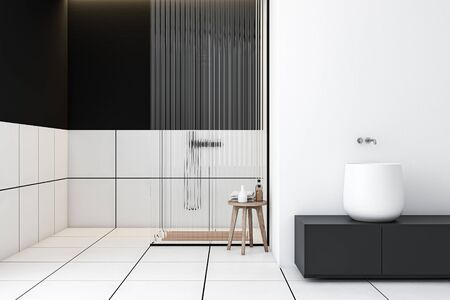 Interior of modern bathroom with white and black walls, tiled floor, shower stall with glass wall and massive sink standing on gray countertop. 3d rendering