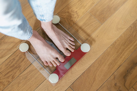 Scale Man Feet Standing On Weight Scale In Bathroom. Cholesterol Control