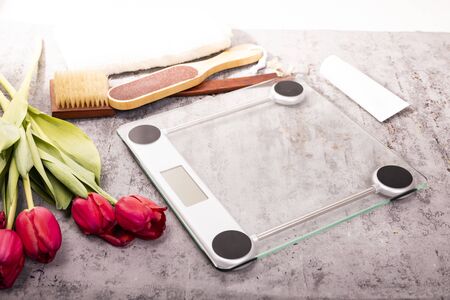 Home SPA concept, bathroom stuff. An electronic scale on a gray stony floor in a cozy bathroom, decorated with red tulips. Weight control. Body care, harmony, balance, relax
