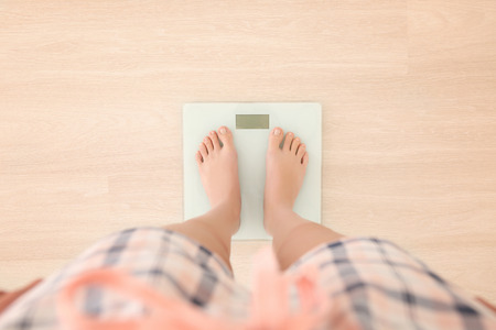 Bare feet woman checking her weight on weighing scales in bathroom. Female measuring her weight using digital scales on floor.