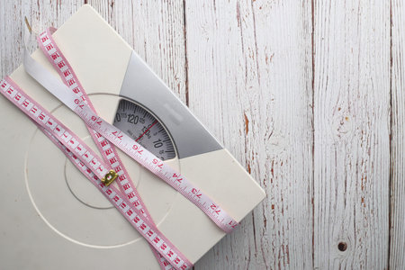 Bathroom scale with measuring tape on wooden background. Weight loss concept