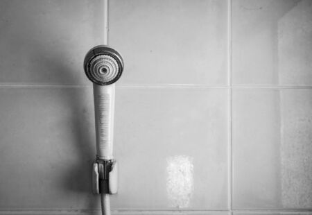 black and white shower head hanging on tile wall background
