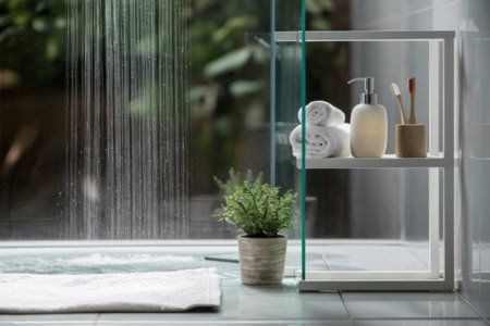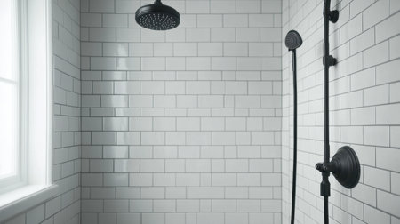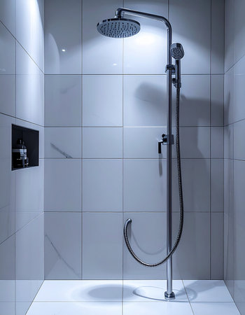 This image showcases a modern shower space featuring elegant fixtures and bright tiles. The serene atmosphere and minimalistic design create a refreshing oasis for relaxation.