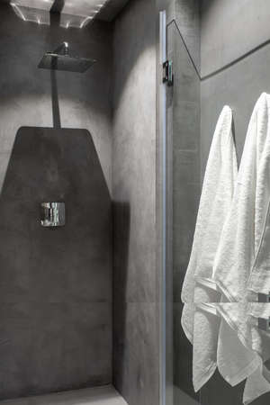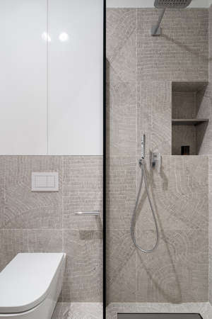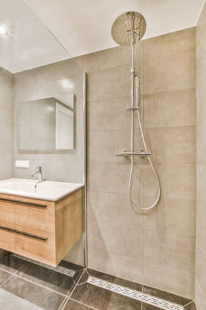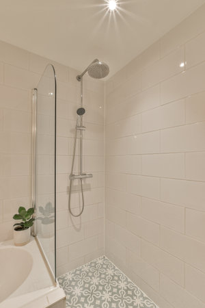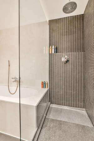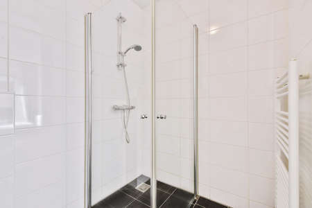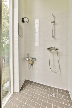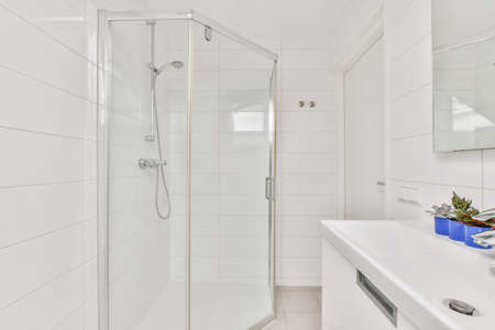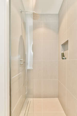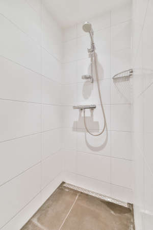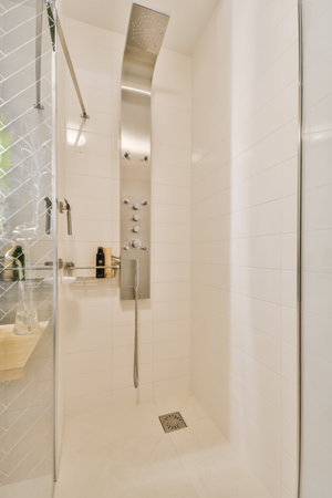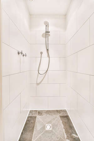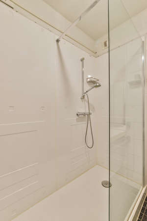 Rain shower in modern bathroom, modern interior apartment design photo in bright white colors