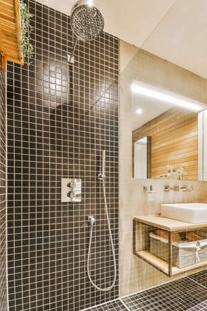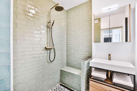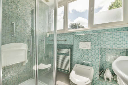 interior of modern bathroom with tiled walls