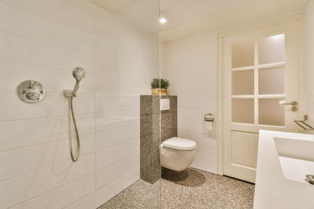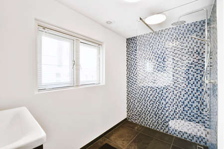 The interior of a bathroom with a shower in a modern house