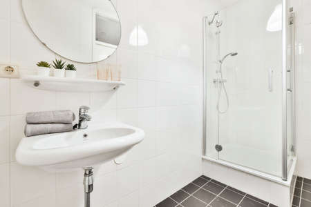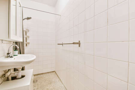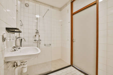 Simple bathroom with white tiled walls and ceramic sink,shower cabinet