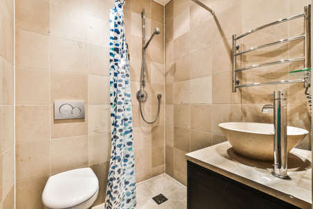 Flush toilet located between sink and shower in small tiled bathroom of contemporary apartment