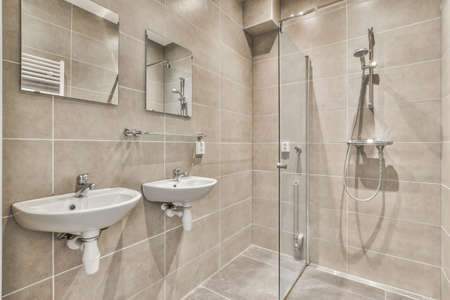 Interior of modern bathroom with rectangular mirror and clean sinks attached to white tiled wall near shower cabin in modern washroom