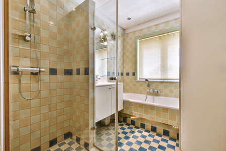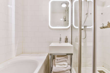 Bathroom with bathtub, shower cabin and sink in a modern and cozy house