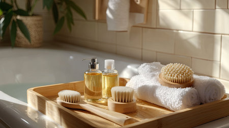 A bathtub scene with bath oils, exfoliating gloves, and a bath brush laid out on a bamboo tray for a relaxing self-care routine.